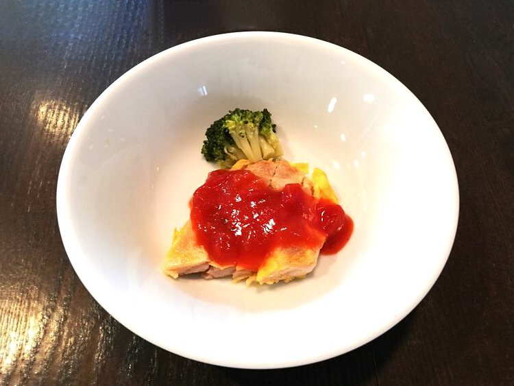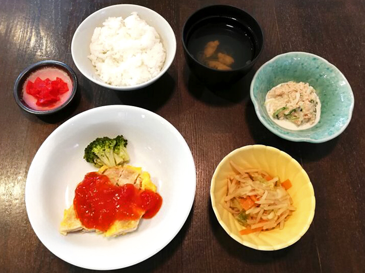 ごはん、あさりのすまし汁、鶏肉のピカタ、白菜の炒め煮、大根とツナのマヨ和え、福神漬け