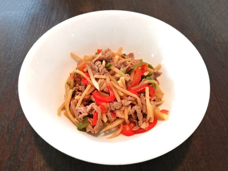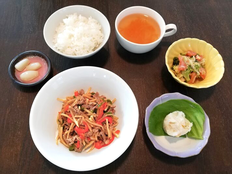ごはん、中華風スープ、青椒肉絲、野菜しゅうまい、ブロッコリーサラダ、らっきょう漬け