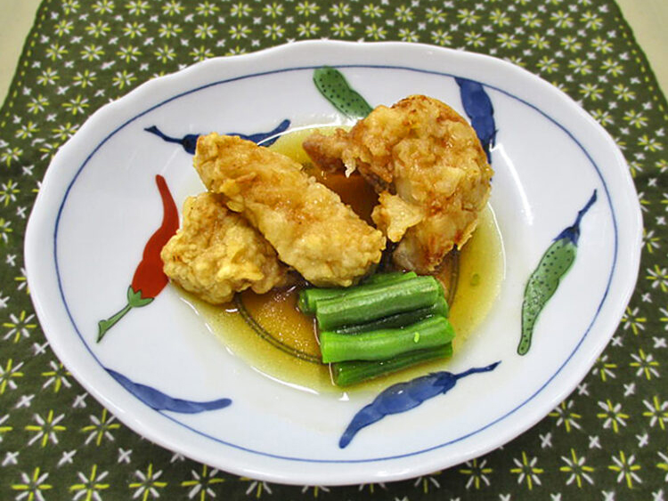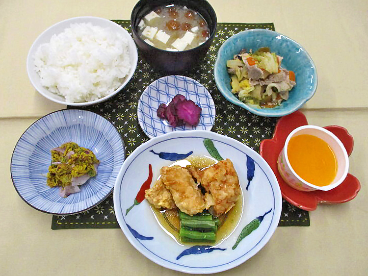 ご飯、豆腐となめこのみそ汁、めばるの揚げ煮、白菜とエリンギの甘酢炒め、かぶのゆかり和え、しば漬、みかんゼリー