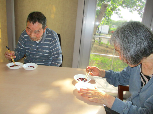 さて今日は、小豆を皿に移し替えるレクを皆様で行ないました。