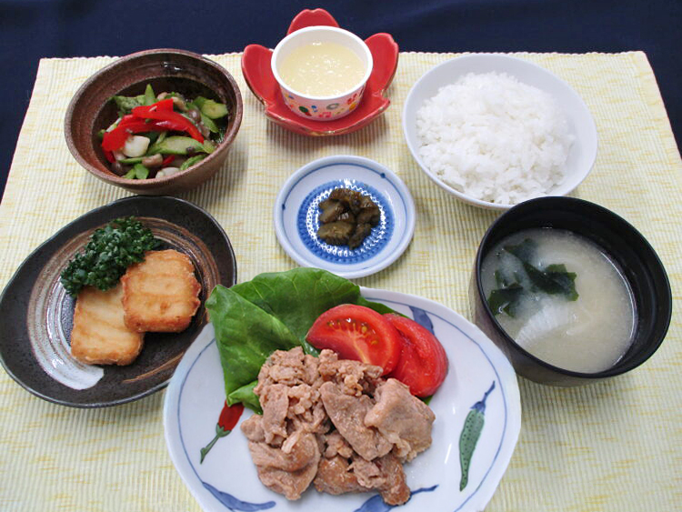 ご飯、玉葱とわかめのみそ汁、豚肉のオイスターソース焼き、アスパラといかのソテー、豆腐ナゲット、相馬きゅうり漬、ラフランスゼリー