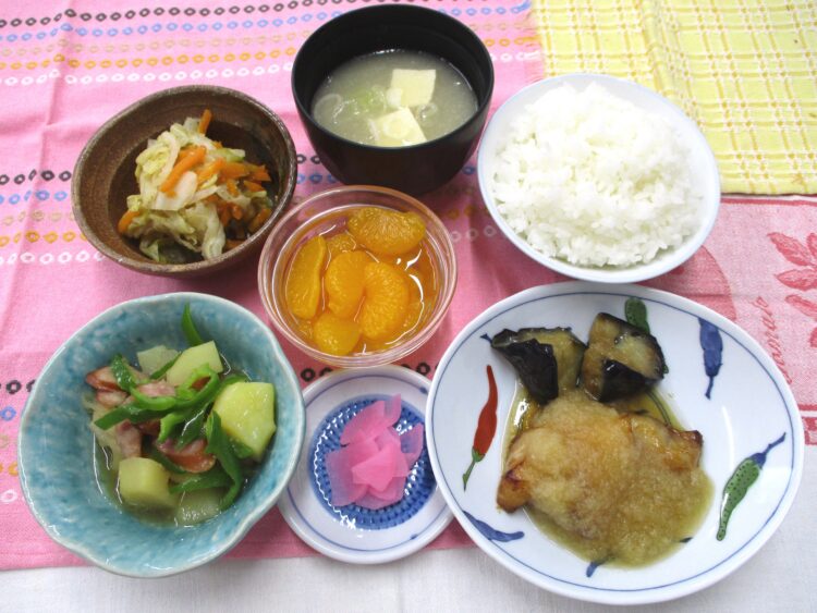 ご飯、焼き豆腐とねぎのみそ汁、赤魚のおろしあんかけ、じゃが芋とウインナーのソテー、