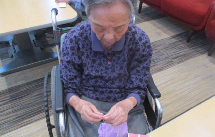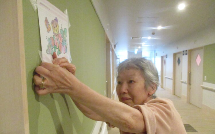 皆様がレク活動の時間に塗って下さった塗り絵を壁に飾り付けるのを手伝って下さる方、