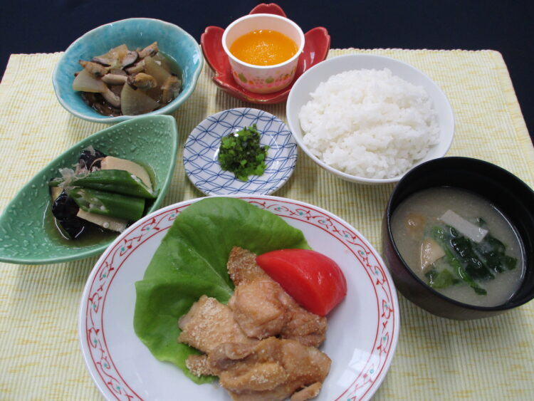 ご飯、ほうれん草と板麩のみそ汁、鶏肉のピーナッツ焼き、大根とあさりの炒め物、なすと高野豆腐の生姜煮、青じその実漬、みかんゼリー