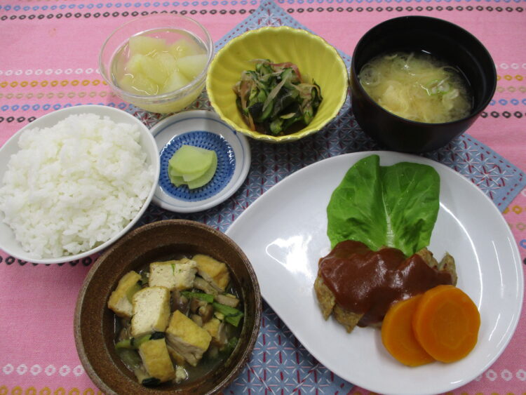 ご飯、かきたま汁、ハンバーグデミソース、生揚げと小松菜の煮物、わかめとみょうがの酢の物、かつおたくあん漬、洋梨缶