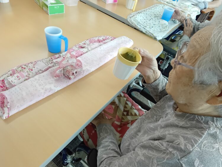 『ここに飾ってもいい?』と目の前に置いてお茶を飲まれている様子です。
