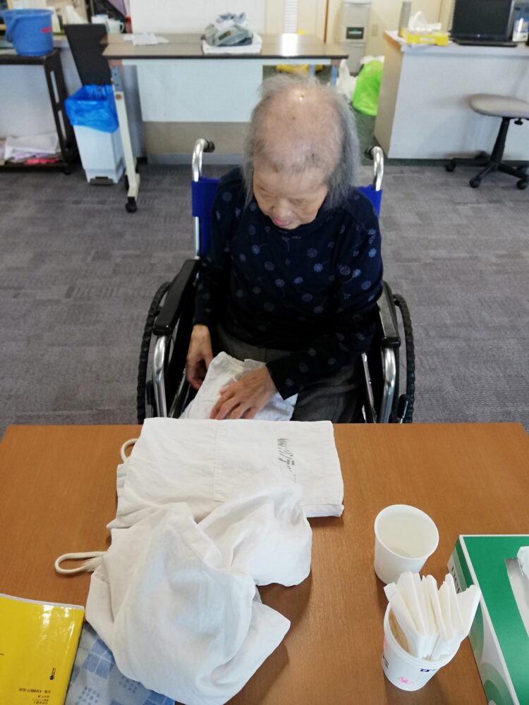 K様に本日は業者洗濯用の袋を畳んでいただいておりました。声掛けすると「何ぼでもやるわよ」と快く快諾していただきました。他にも洗顔用タオルやエプロン等も畳んでいただいたりしてもらっています。