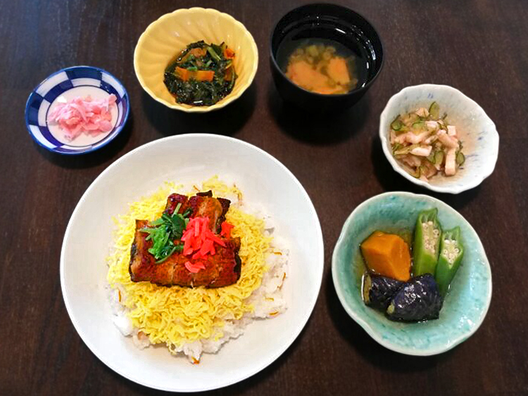 うなぎちらし、なるとのすまし汁、夏野菜の炊き合わせ、ほうれん草のお浸し、長芋の梅肉和え、がり