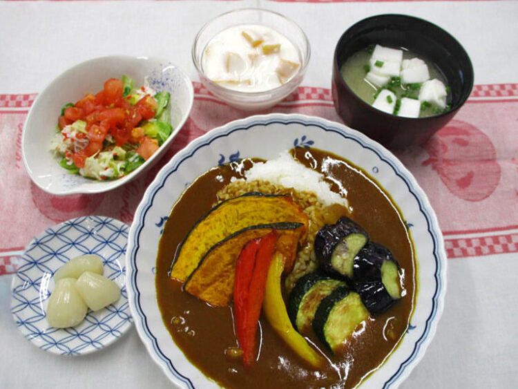 ご飯、はんぺんと万能ねぎのみそ汁、夏野菜カレー、レタスとカニカマのサラダ、らっきょう漬、ピーチヨーグルト