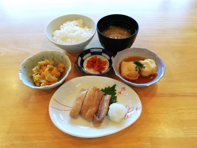 ごはん、じゃが芋のみそ汁、鶏肉の照り焼き、揚げ出し豆腐、白菜の数の子和え、赤しその実漬け