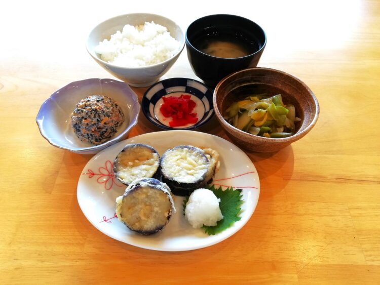 ごはん、細竹のみそ汁、なすの挟み揚げ、アスパラソテー、ひじきの白和え、福神漬け
