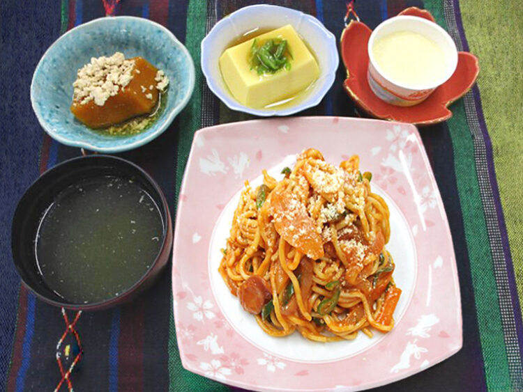 スパゲティナポリタン、わかめスープ、南瓜のそぼろ煮、卵豆腐のあんかけ、豆乳プリン