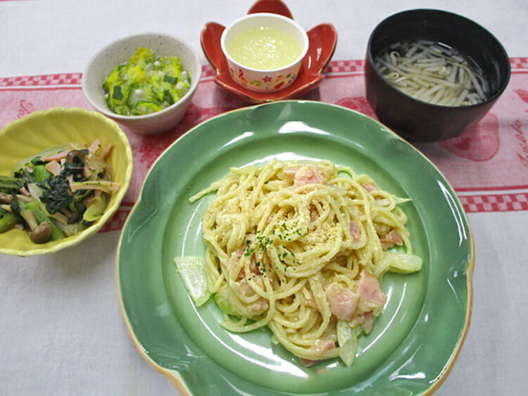 カルボナーラ、かにかまのコンソメスープ、小松菜とハムのソテー、オクラと菊のおろし和え、ラフランスゼリー
