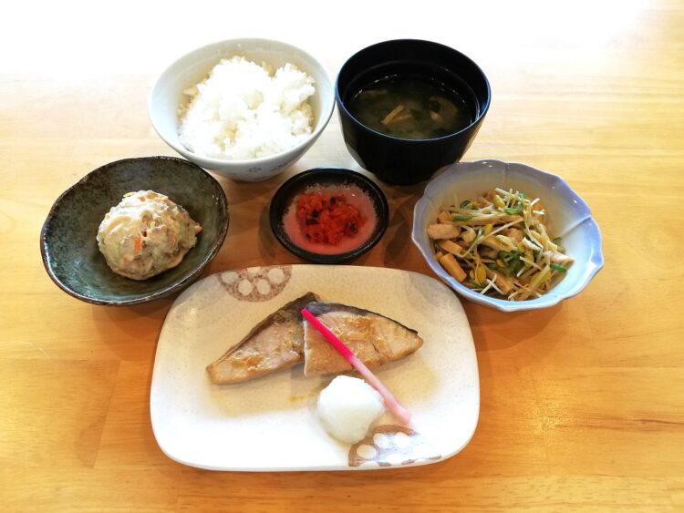 ごはん、ほうれん草のみそ汁、ぶりの西京焼き、長もやしの炒め物、舞茸の白和え、