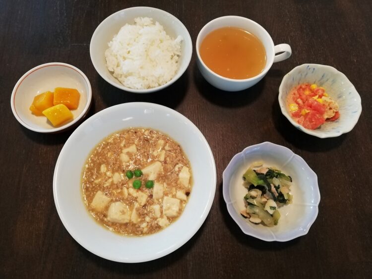 ごはん、春雨のスープ、麻婆豆腐、青梗菜のソテー、カリフラワーサラダ、マンゴー