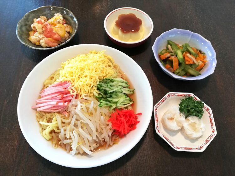 冷やし中華、蒸ししゅうまい、アスパラの炒め煮、カリフラワーサラダ、プリン