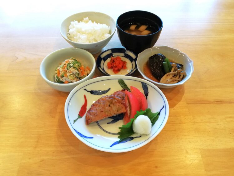 ごはん、みょうがのみそ汁、イカメンチステーキ、なすの煮付け、ささみ胡麻だれサラダ、