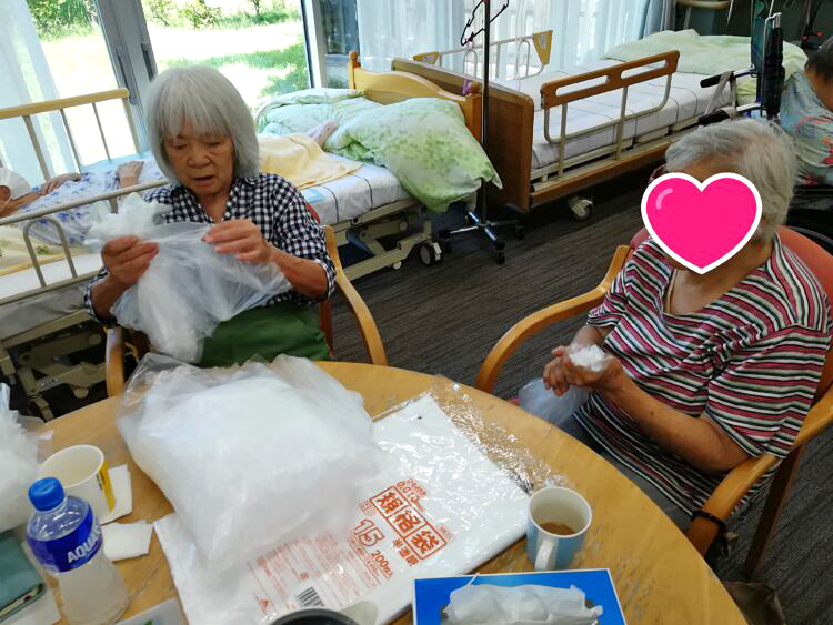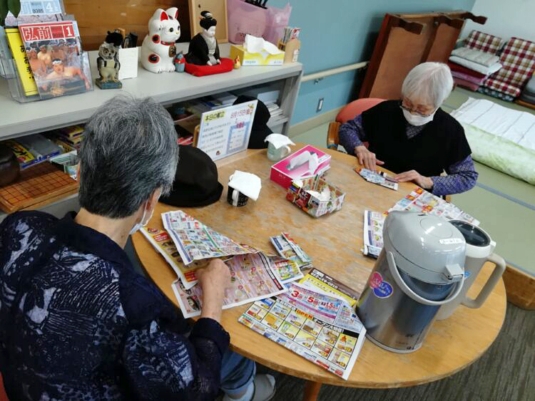 ビニール袋を開いて使いやすくまとめておくチームとチラシで箱を折るチーム!