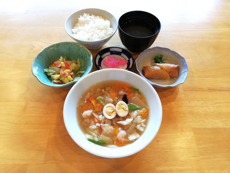 ごはん、めかぶのスープ、八宝菜、春巻き、レタスのサラダ、桜大根漬け