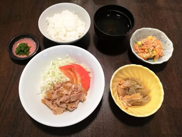 ごはん、岩のりのみそ汁、豚肉の生姜焼き、ふきの炒め物、人参とツナのサラダ、しその実漬け