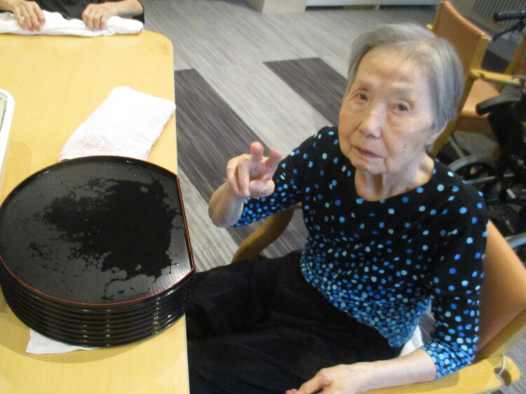 夕食後に、食器拭きの手伝いをお願いしたところ、笑顔をこちらに向けてくれたH様