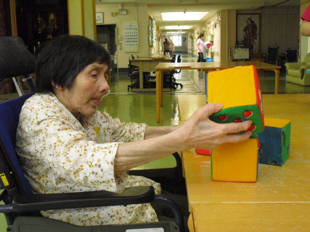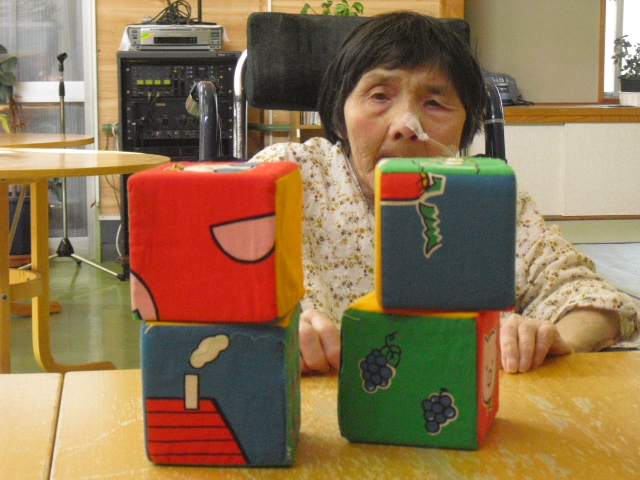 CIMG8748ここんにちは!今日は、リハビリが大好きなS.H様の様子をお知らせしますね。 CIMG8744S.Hさまは、ボールを使うのを好まれるんですが、得意なことばかりではいろいろな部位が働かないので、今日はソフト積み木をやっていただきました。 CIMG8742一一見簡単に見えるかもしれませんが、年配の方は指先に力が入らなくなり、自分の手より大きなものを掴むということが、困難になってきます。S.H様は、まず自分の近くに集めてから、積むという建設的な順番で最後まで頑張られました。お見事!!        (看護 I.Y)
