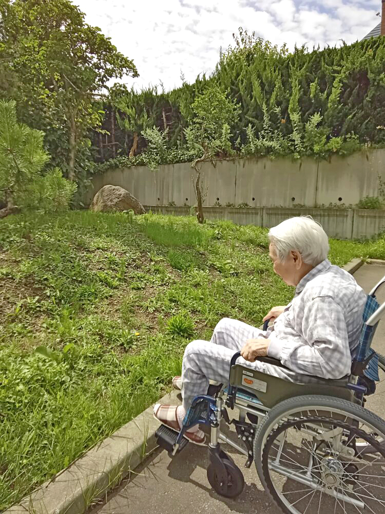 本日午後、E様を中庭へご案内し、短時間の外気浴を行いました。