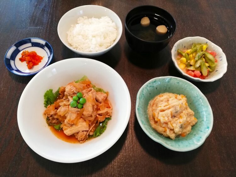 ごはん、麩のすまし汁、和風ポークソテー、卯の花炒り煮、アスパラの和え物、赤しその実漬け