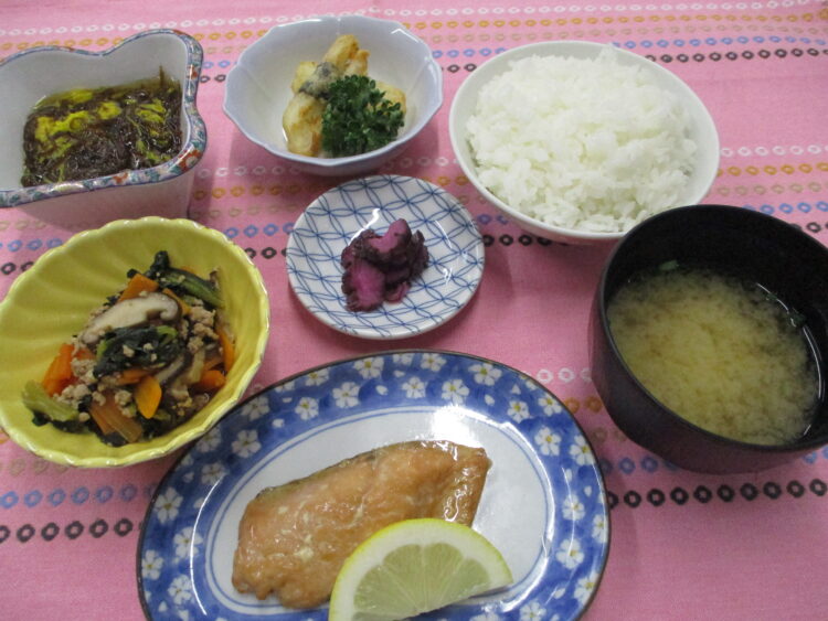 ご飯、かぶと万能ねぎのみそ汁、鮭の和風ムニエル、小松菜とひき肉の炒め物、ながいも短冊揚げ、菊ともずくの酢の物、しば漬