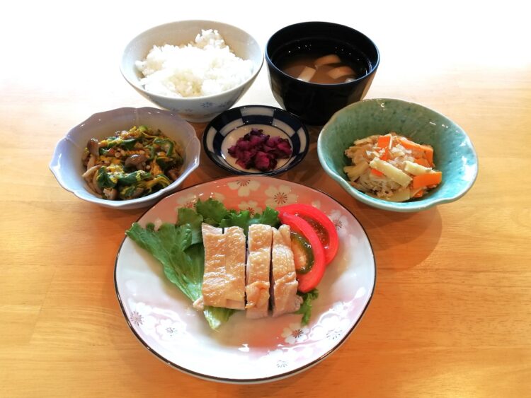 ごはん、麩のみそ汁、鶏肉の照り焼き、たけのこの炒め物、オクラの和え物、しば漬け