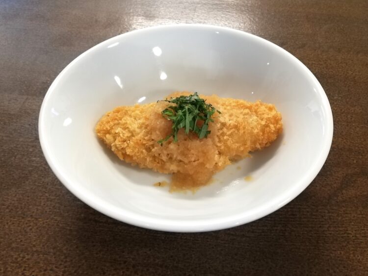 ごはん、豆腐のみそ汁、白身魚フライ、つみれのスープ煮、長芋のサラダ、たくあん漬け