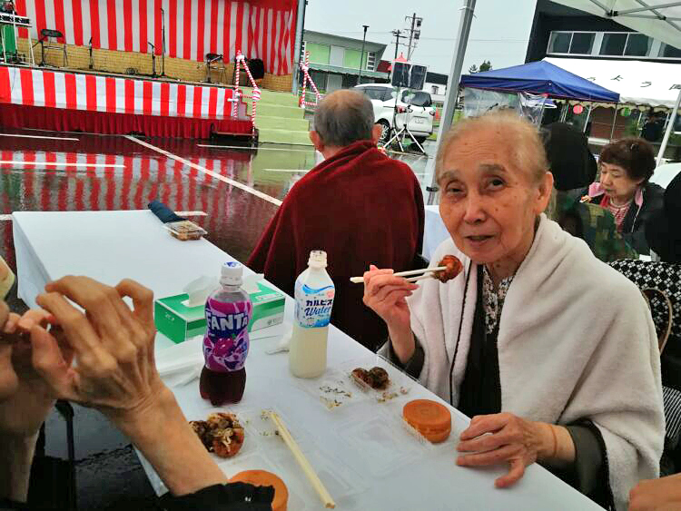 またもう一つの楽しみでもあるおやきや、フランクフルトなどを食べながら祭りの演目を幸せの満面の笑み