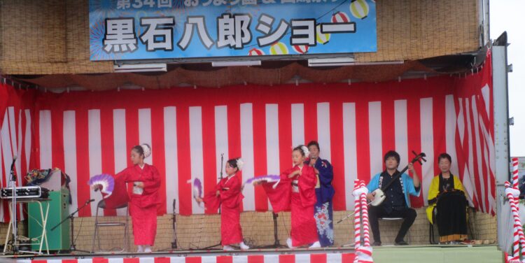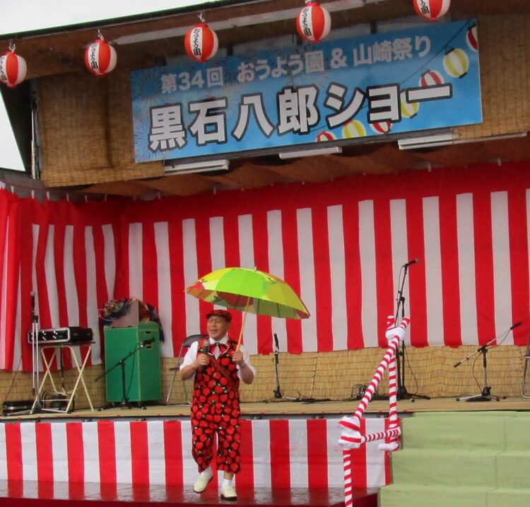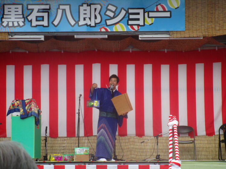 サプライズとして、100歳を迎えるT様へ黒石八郎様よりプレゼントを頂きました。そして一緒に写真を撮影し、T様は大変喜んでいらっしゃいました。黒石八郎ショーでは子供たちの踊りや本間愛音様のショーやスペシャルゲストとして横山ひでき様による三味線の演奏やマジックショーも行われ、大変盛り上がっておりました。