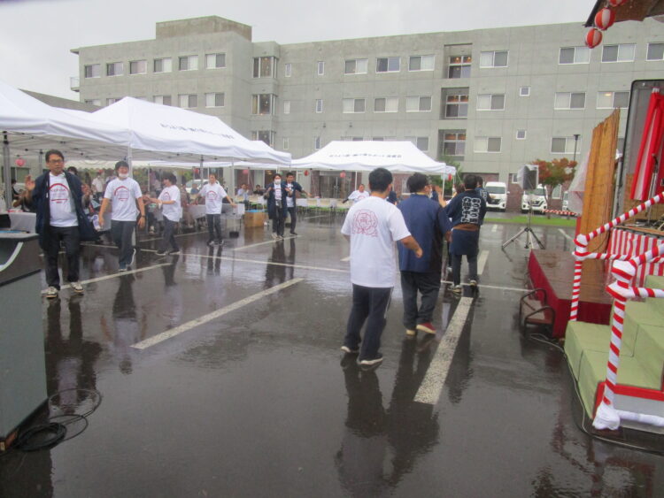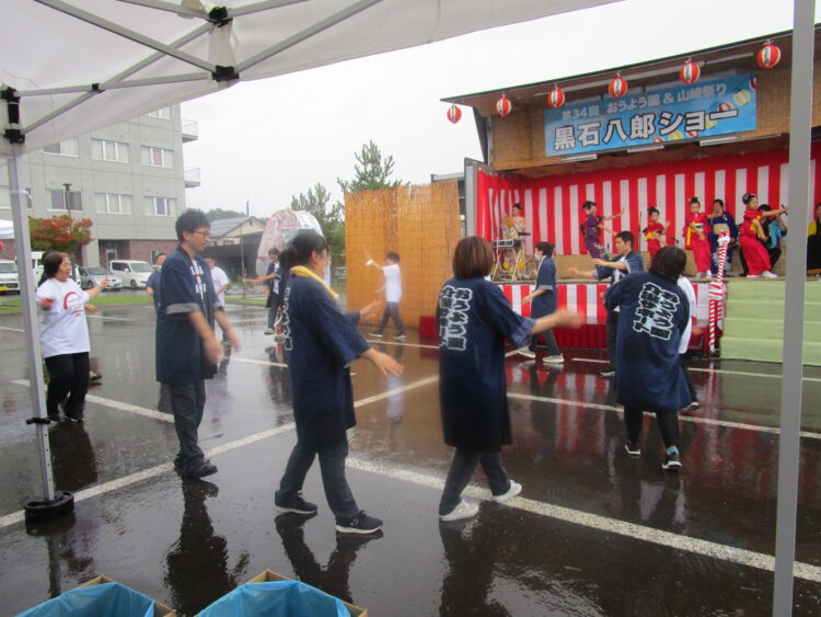 昨日はおうよう園&山崎祭りが行われました。残念ながら昨年に引き続き雨でしたが、施設内で他お客様と一緒にお食事をしながら視聴されたり、テントの中でご家族様と一緒に楽しい時間を過ごされたりと、とても盛り上がっておりました。余興は弘前櫻会の皆様によるよさこい演舞、職員による余興(盆踊り)、黒石八郎ショーが行われました。