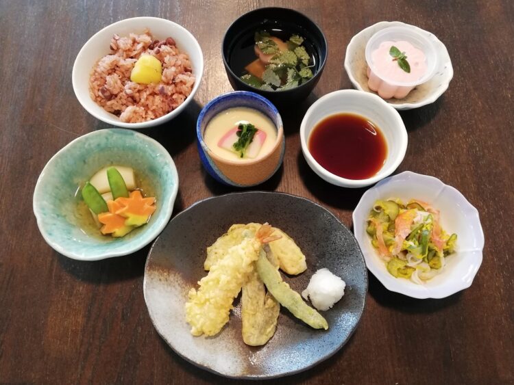 赤飯、花麩のすまし汁、天ぷら、茶碗蒸し、かぶの炊き合わせ、胡瓜の和え物、いちごムーズ