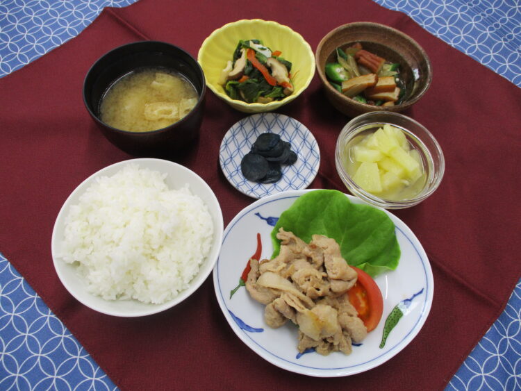 ご飯、かぶと油揚げのみそ汁、豚肉の生姜焼き、ほうれん草といかのソテー、ふきとオクラの炊き合わせ、なす漬、パイン缶