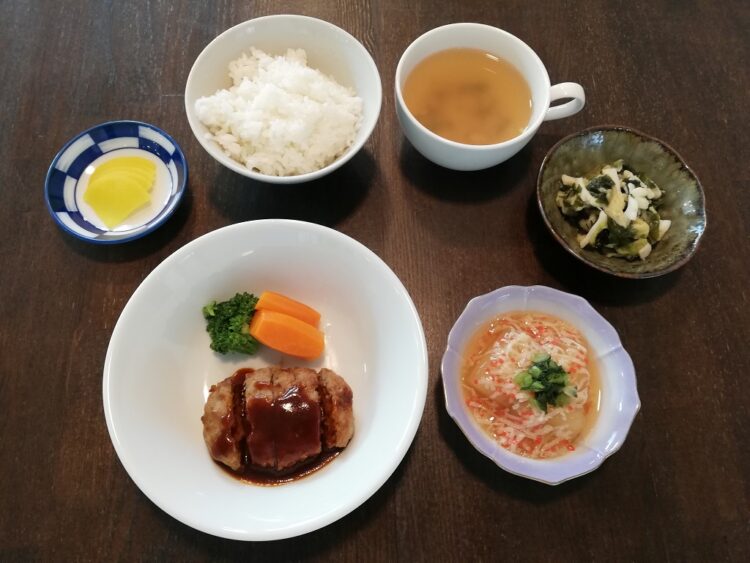 ごはん、あさりのスープ、デミグラスハンバーグ、冬瓜のかにあんかけ、いかの酢の物、