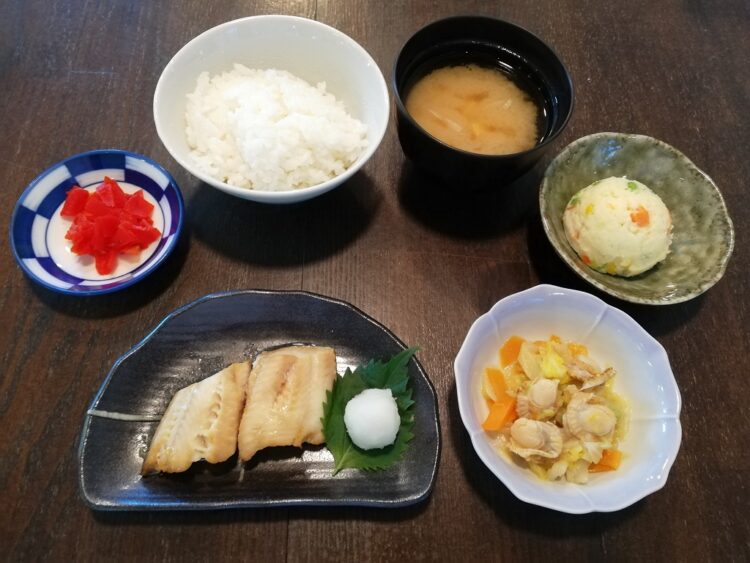 ごはん、豆腐のみそ汁、ホッケの醤油漬け焼き、白菜と帆立の炒め煮、ポテトサラダ、福神漬け