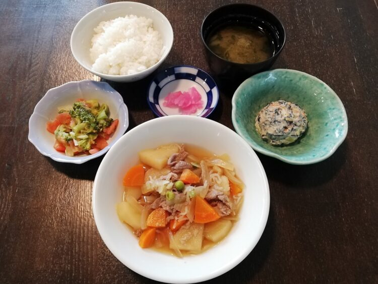 ごはん、大根葉のみそ汁、肉じゃが、ひじきの白和え、レタスのサラダ、桜大根漬け