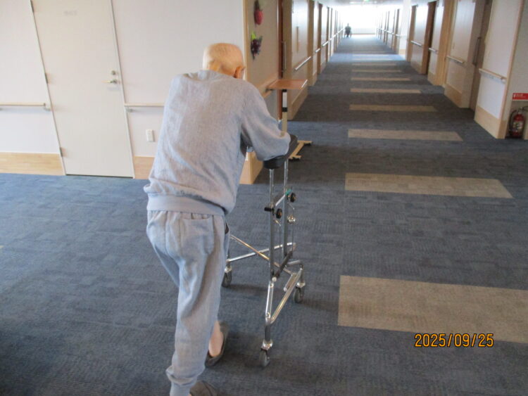 そしてお茶会が終わると歩行器を使って歩行訓練を自主的に行っております。長い廊下の往復を繰り返しております。素晴らしいですね。