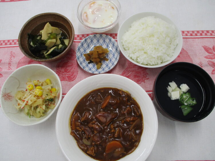 ご飯、オクラと豆腐のスープ、ハヤシライス、大根と水菜のドレッシング和え、たけのこといかの煮物、福神漬、みかんヨーグルト
