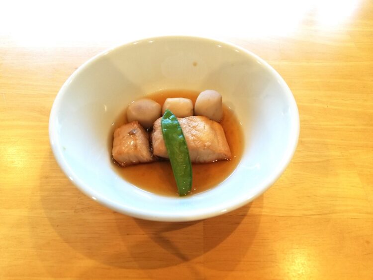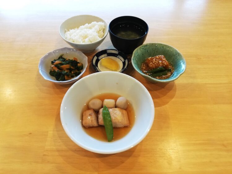 ごはん、オクラのすまし汁、さめの煮付け、南瓜の煮物、ほうれん草の和え物、たくあん漬け