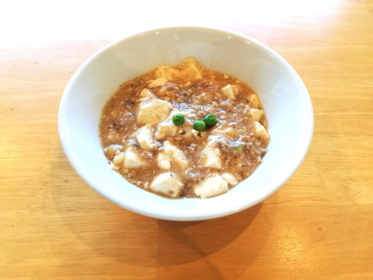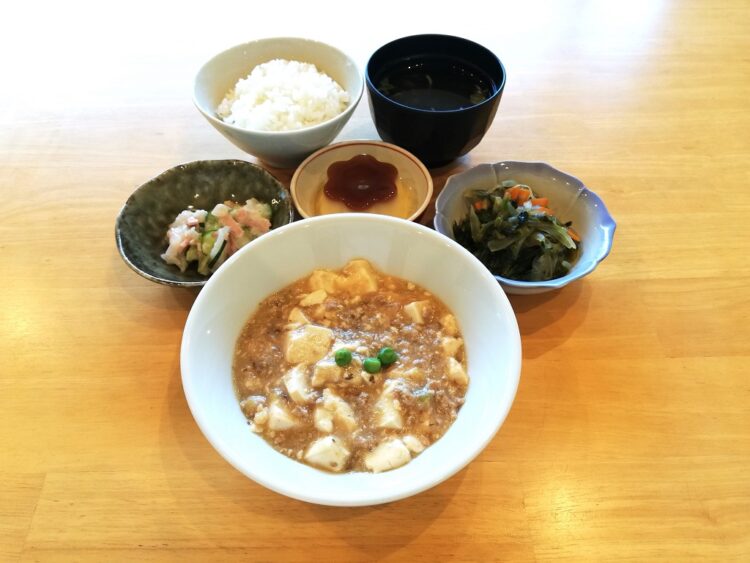 ごはん、中華風スープ、麻婆豆腐、ほうれん草のソテー、かぶのサラダ、プリン