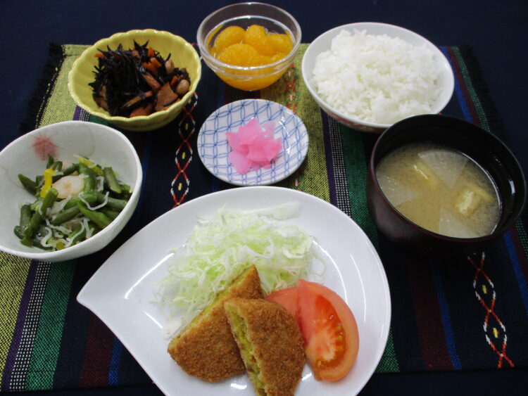 ご飯、大根と油揚げのみそ汁、カレーコロッケ、いんげんとえびの炒め物、ひじきと大豆の炒め煮、桜大根漬、みかん缶