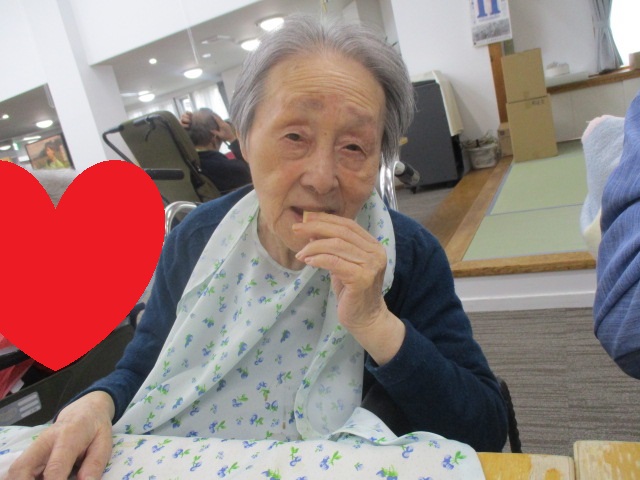 その際、落ちたひざ掛けを隣のⅠ様が拾ってくれた時に、「ひとっつどうぞ」とT様からⅠ様へお菓子をおすそ分けする場面がありました。「美味しい!美味しい!」と笑顔で話されており、とてもほっこりしたひと時でした。