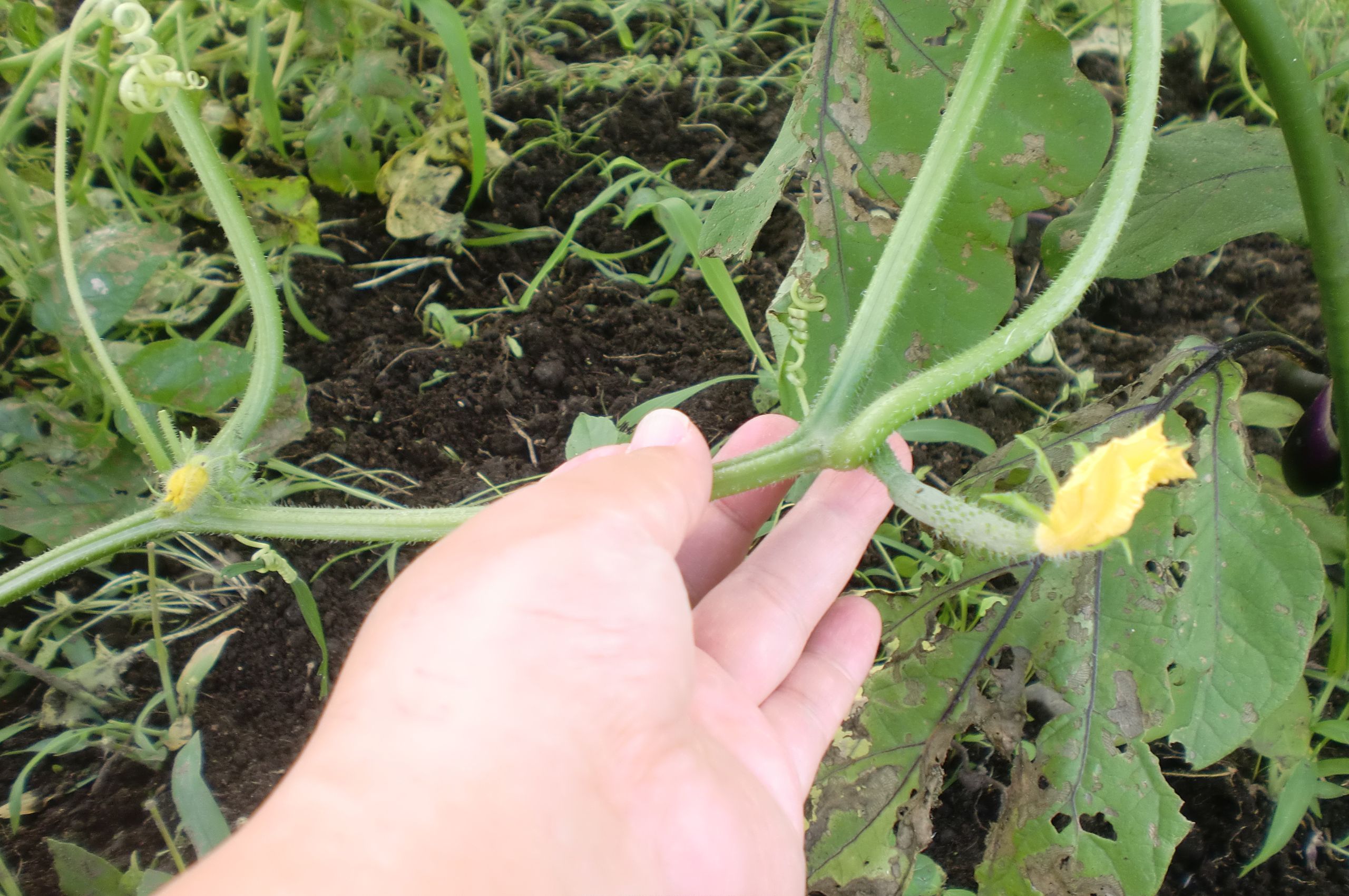 はい!こちらは、キュウリですが・・・黄色い花の先に小さな小さな実っこが付き始めました~