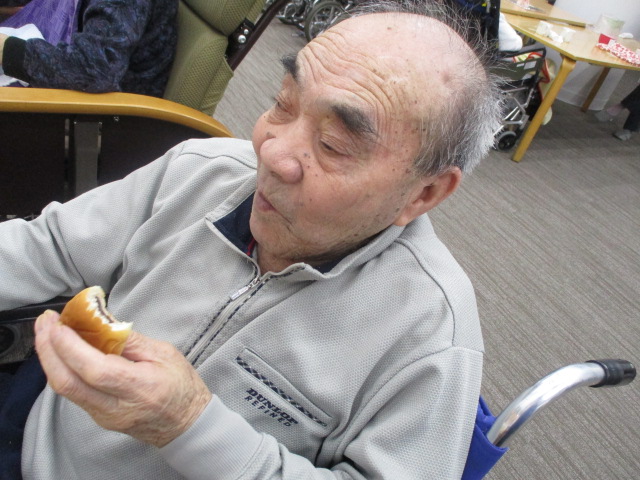 O様はご家族様から頂いたあんパンとジュースを飲みながらテレビを見て過ごされていました