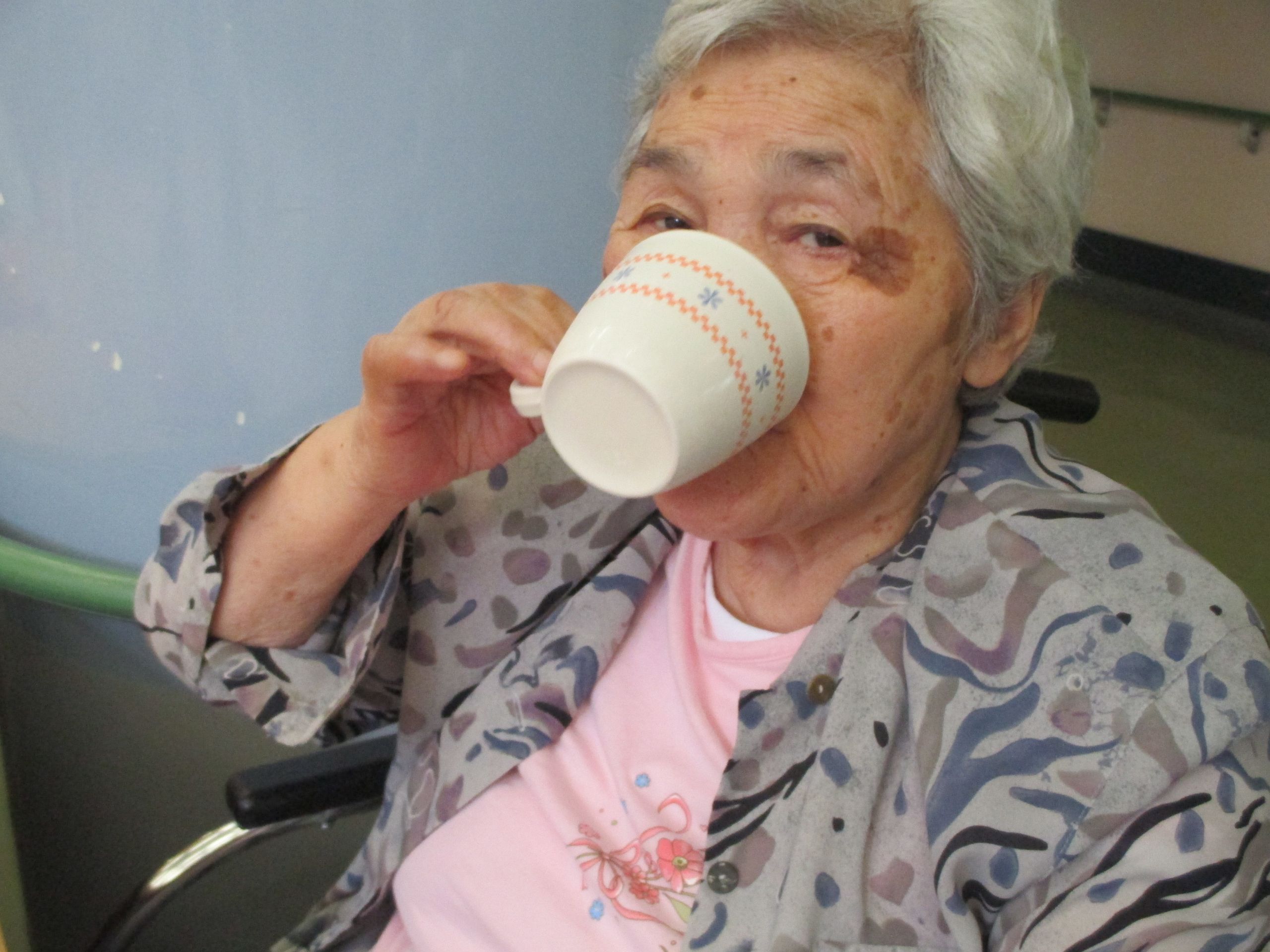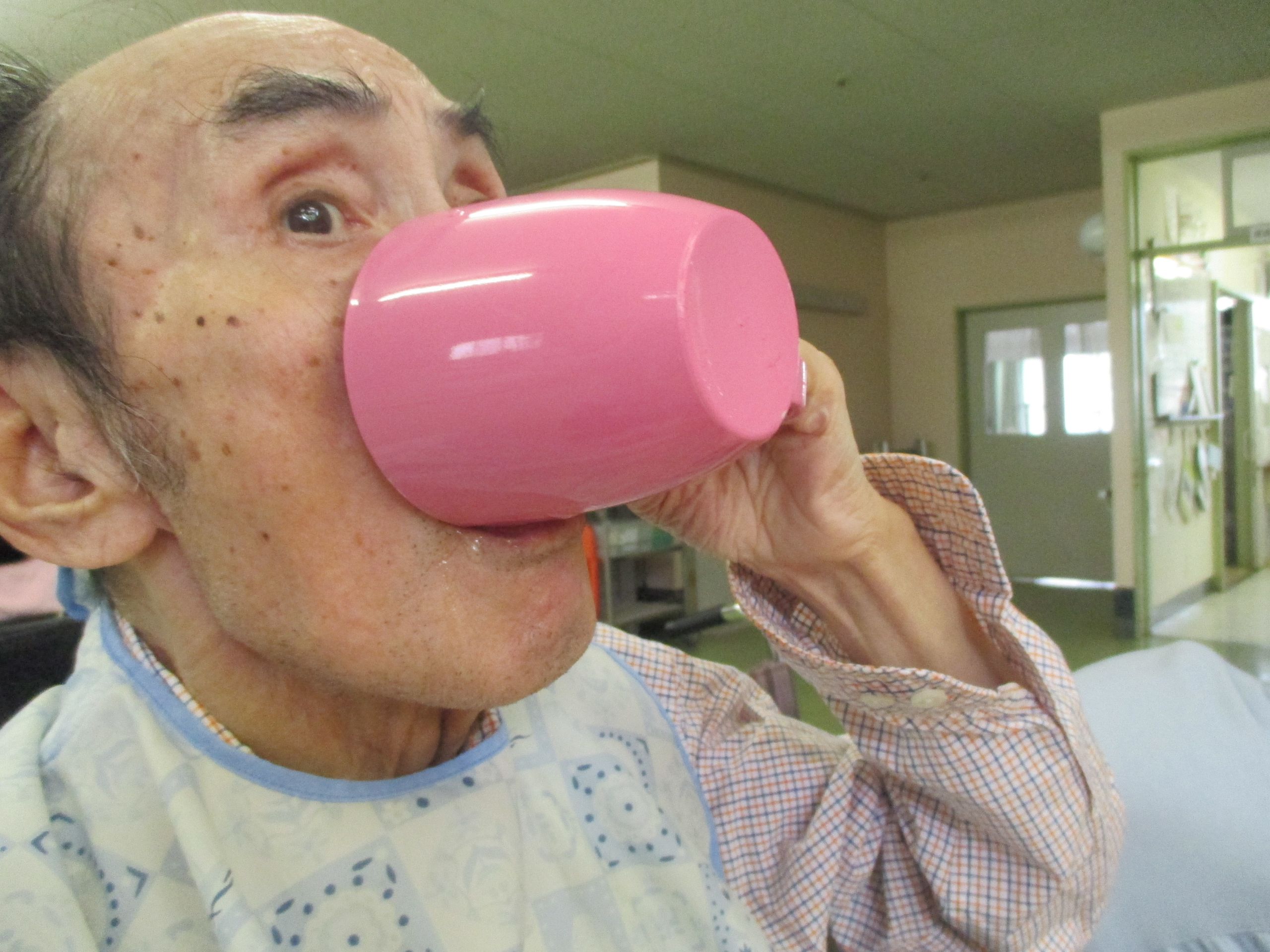 T様は離床してすぐコップを手に取り水分を飲みます。