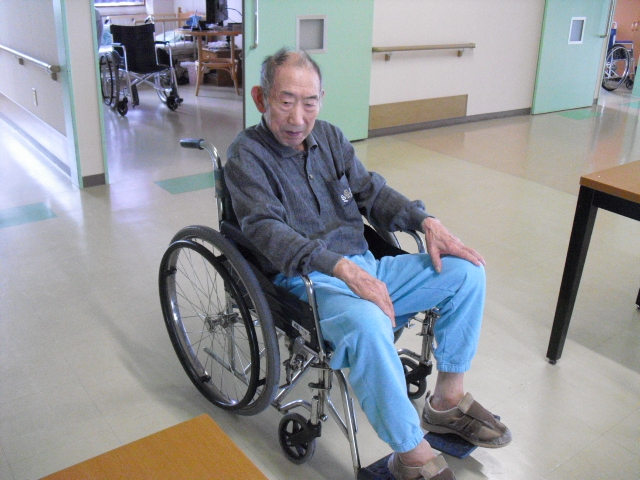 車椅子は、歩行が不安になって使い始め、人に押してもらうというふうに思っていませんか。歩くという行為を補ってはもらうんですが、他人に頼りっぱなしという訳ではありません。今日、お写真を撮らせて頂いたN.N様。この方は、ご自分で手や足を使って、お部屋や廊下を移動なさいます。歩くということは、車椅子に助けてもらいますが、同時にタイヤを腕を使い、脚でも前進するんです。歩かないからといって、脚や他が弱ってしまうわけではないんですよ。