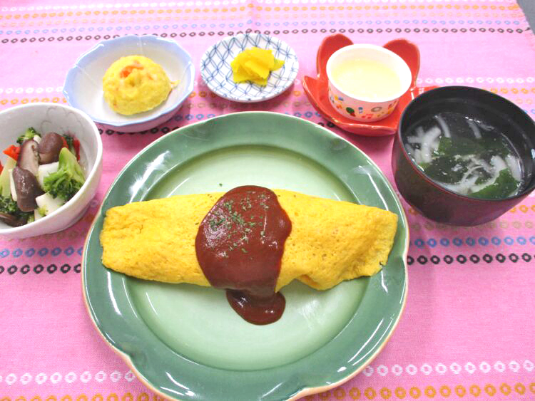 オムライス、わかめスープ、ブロッコリーといかのソテー、さつま芋のサラダ、かつおたくあん、